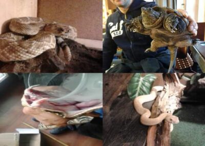 Elkóborolt egzotikus házi kedvenc – például papagáj, leguán, teknős vagy akár nyaralásból „hazahozott” skorpió, kígyó – befogása kíméletes, szakértő módon, szükség esetén speciális eszközökkel.